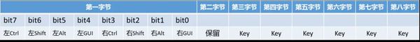 第一个字节表示8个特殊的按键,第二个字节保留,后面6个字节的每个字节都可以表示一个按键的状态,可以同时有多个按键按下。